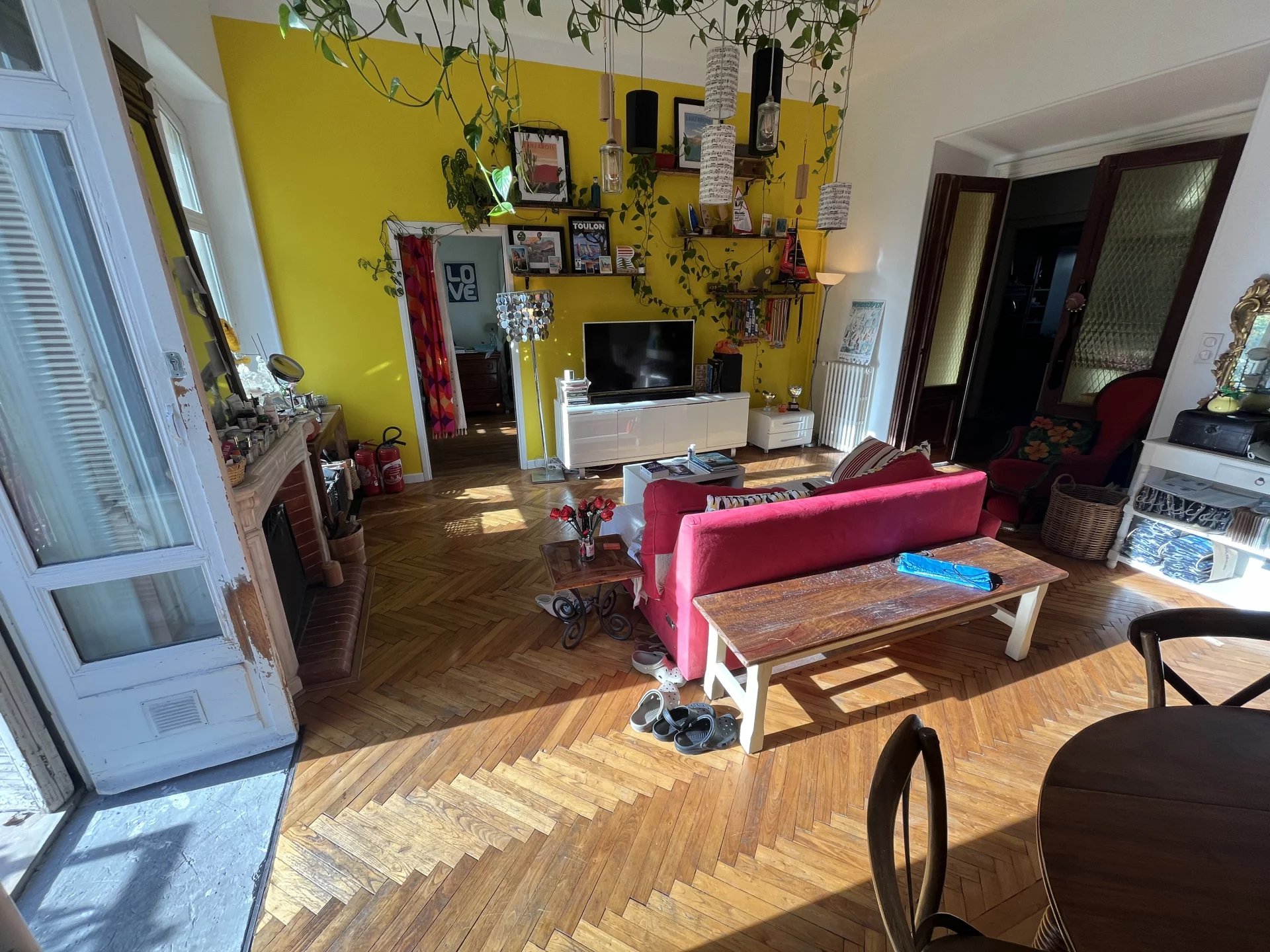 Cachet bourgeois : Parquets d’époque, hauts plafonds et moulures confèrent une âme unique à cet appartement.
